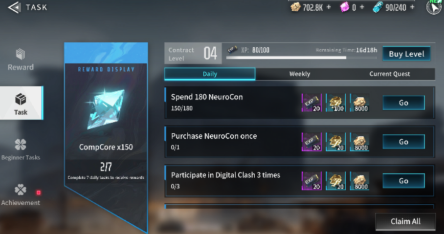 デイリータスクは7つ以上クリアするとバトルパスの進行のほかに青クリスタルが150手に入る