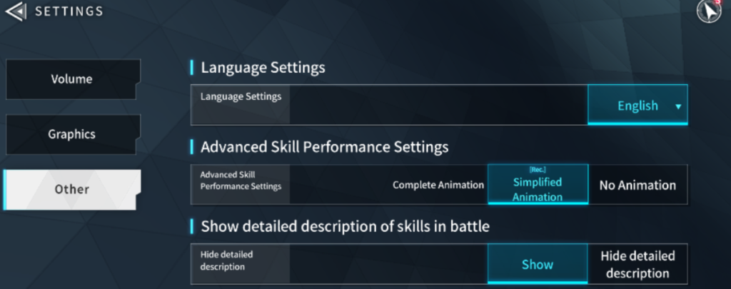 4.Advamced Skill Performance Settings で右端の No Animationを選ぶと、戦闘アニメがカットされる分1度の戦闘が短くなるので累計プレイ時間が大幅に短縮できます。