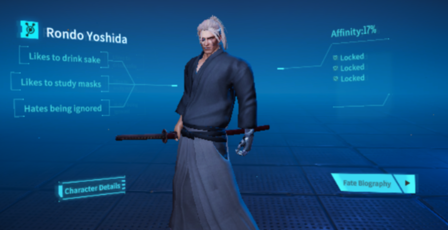 灰色表示のキャラクターを選択すると、鍵付きのFate Biographyがあります。右上の紫の何かを1個分コストにして、解放可能です。右上の数字はおそらく日本時間午前6時更新で1日に1回復します。
