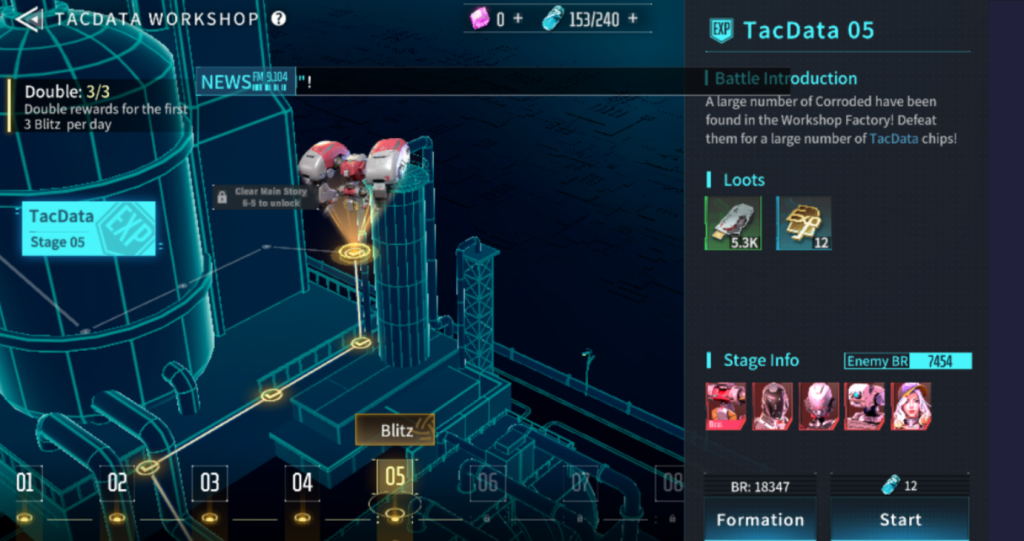 見落としがちな要素として、特に経験値素材が大量に手に入るTACDATA WORKSHOPでは、1日3回まで、クリア後のステージをBlitz(スキップクリア)した場合、報酬が倍手に入ります。