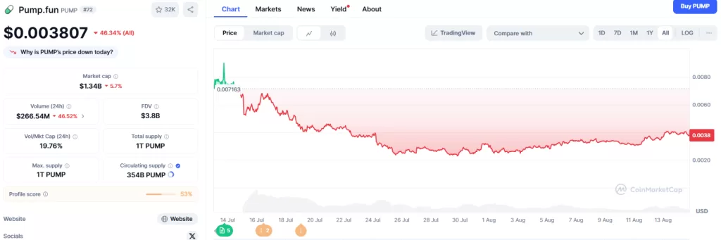 同日、Pump.funは約3,300万ドル相当(総供給の約0.7%)のPUMPを買い戻したことが発表されました。この動きにより、24時間でPUMP価格は15%上昇、さらに市場支配力を高めました。