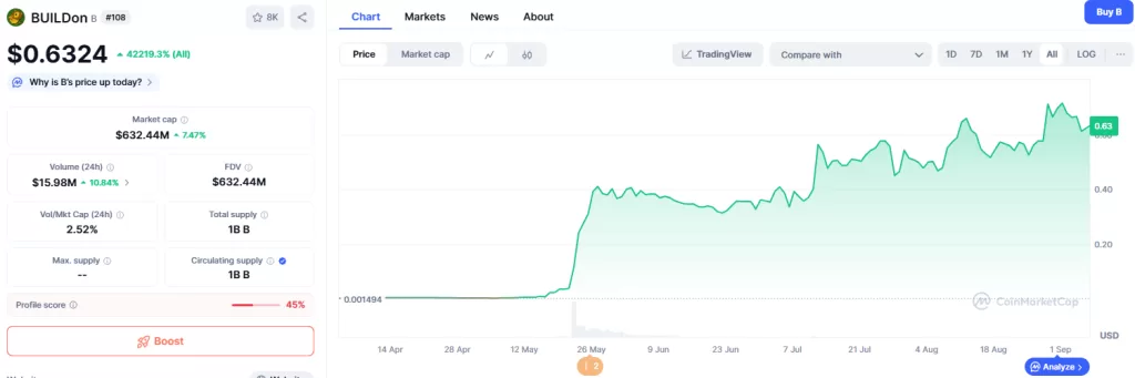 | 2025年8月10日 | BUILDonトークンが史上最高値(ATH)を更新。価格は約0.60ドルに到達、USD1トレーディングペアとしての強さが背景です。 |