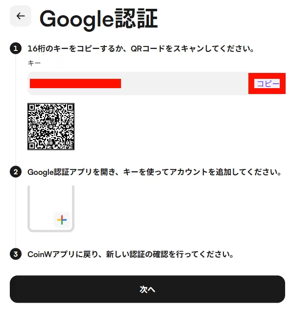 3-4 Google認証の画面でコピーした16桁のキーをGoogle Authenticatorアプリ内で入力して認証を完了します。