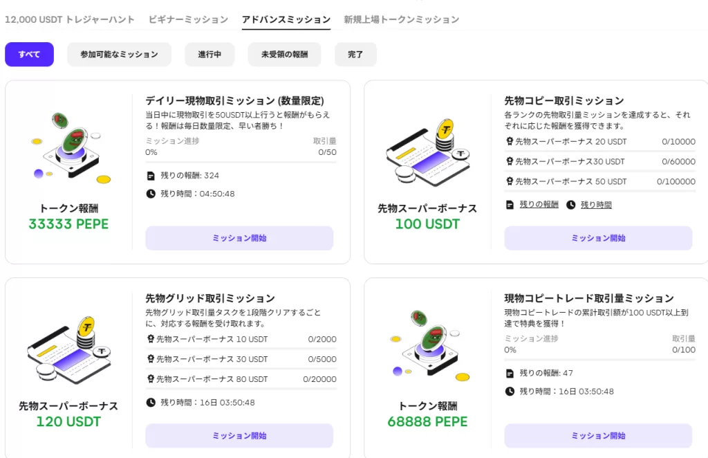 デイリーでの現物取引でPEPEトークンが貰えるミッション等、様々なキャンペーンが日々展開されています。