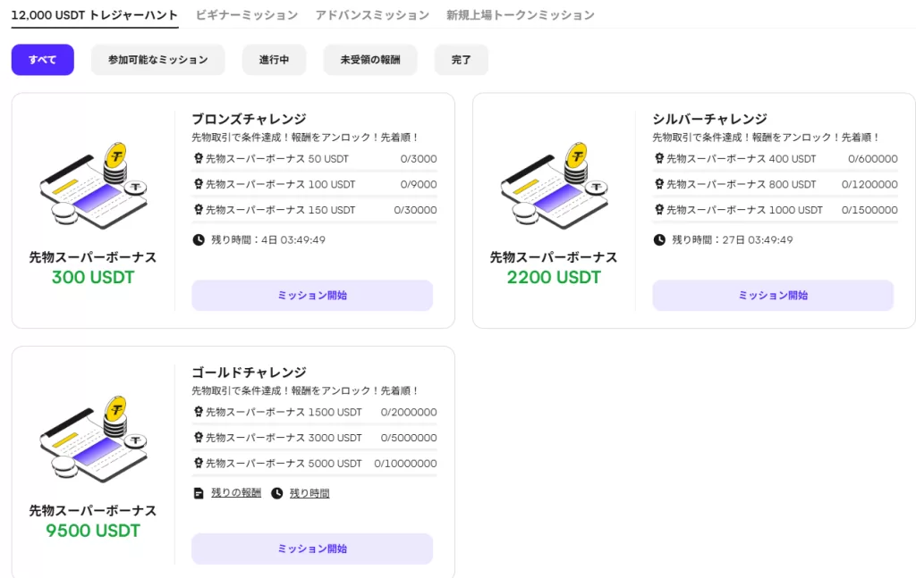 ビギナーミッションではKYCを達成するだけで、取引をノーリスクで楽しめるスーパーボーナス(ポジションエアドロップ)が獲得できたり、現在10USDTを入金するだけで4DOGE=0.65ドル分のトークン(2025/11/14現在価格)を獲得できたりします。