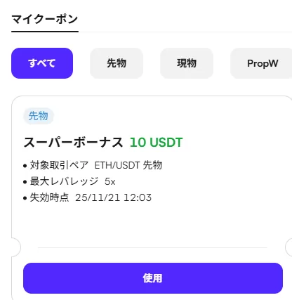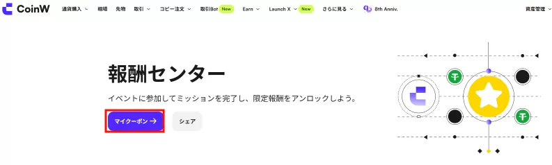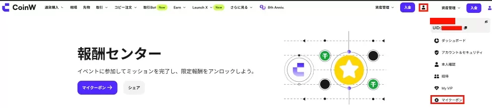 CoinWではあらかじめKYC(本人確認)をした状態で人型のマークからマイクーポンを選択し期間限定のミッションを開始し、達成することで、さまざまな取引をお得にするクーポンを獲得できたり、入金のみで特定のトークンが貰えるキャンペーンが実施されています。