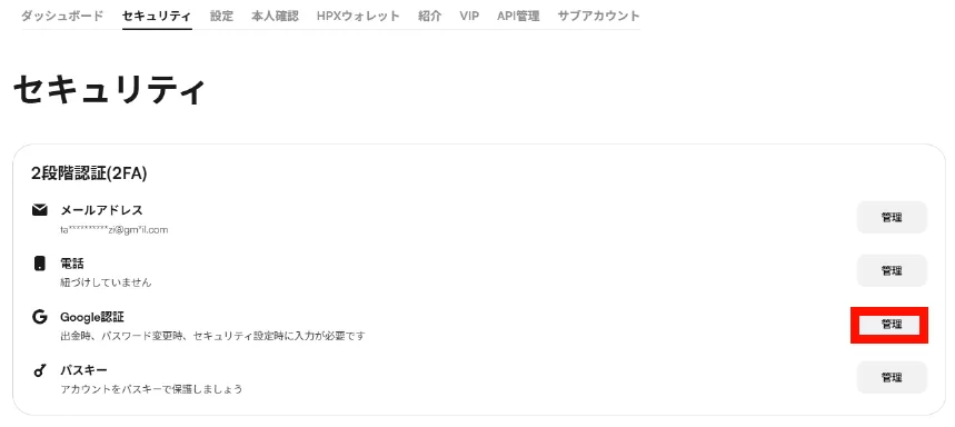 3-2.セキュリティの2段階認証(2FA)の中のGoogle認証の右側にある管理を選択します。