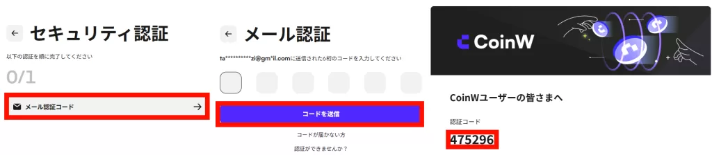 3-3.セキュリティ認証のメール認証コードを選択し、コードを取得を選択後、CoinWから届いたメールの6桁の数字をメール認証の画面で入力します。